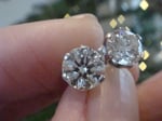 Each 6 prong set natural diamond measures 1ct, just over. These diamond are extremely good quality with a colour estimated in situ at F-G. The diamonds are absolutely flawless to the naked eye. Each diamond has a tiny colourless feather superbly set to completely underneath one claw hence this is not visible and hardly visible with a 20x loupe. The 99% remaining has a flawless clarity with a 20x loupe at VVS1