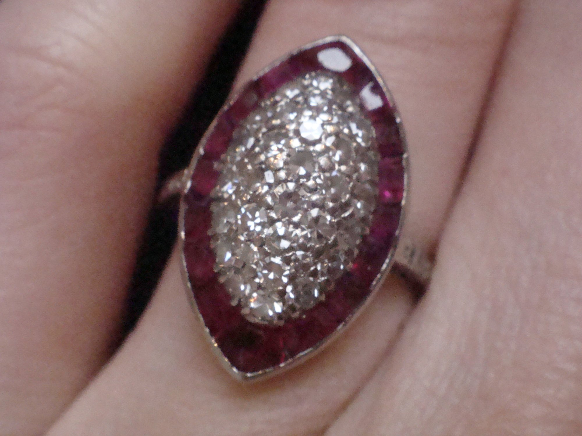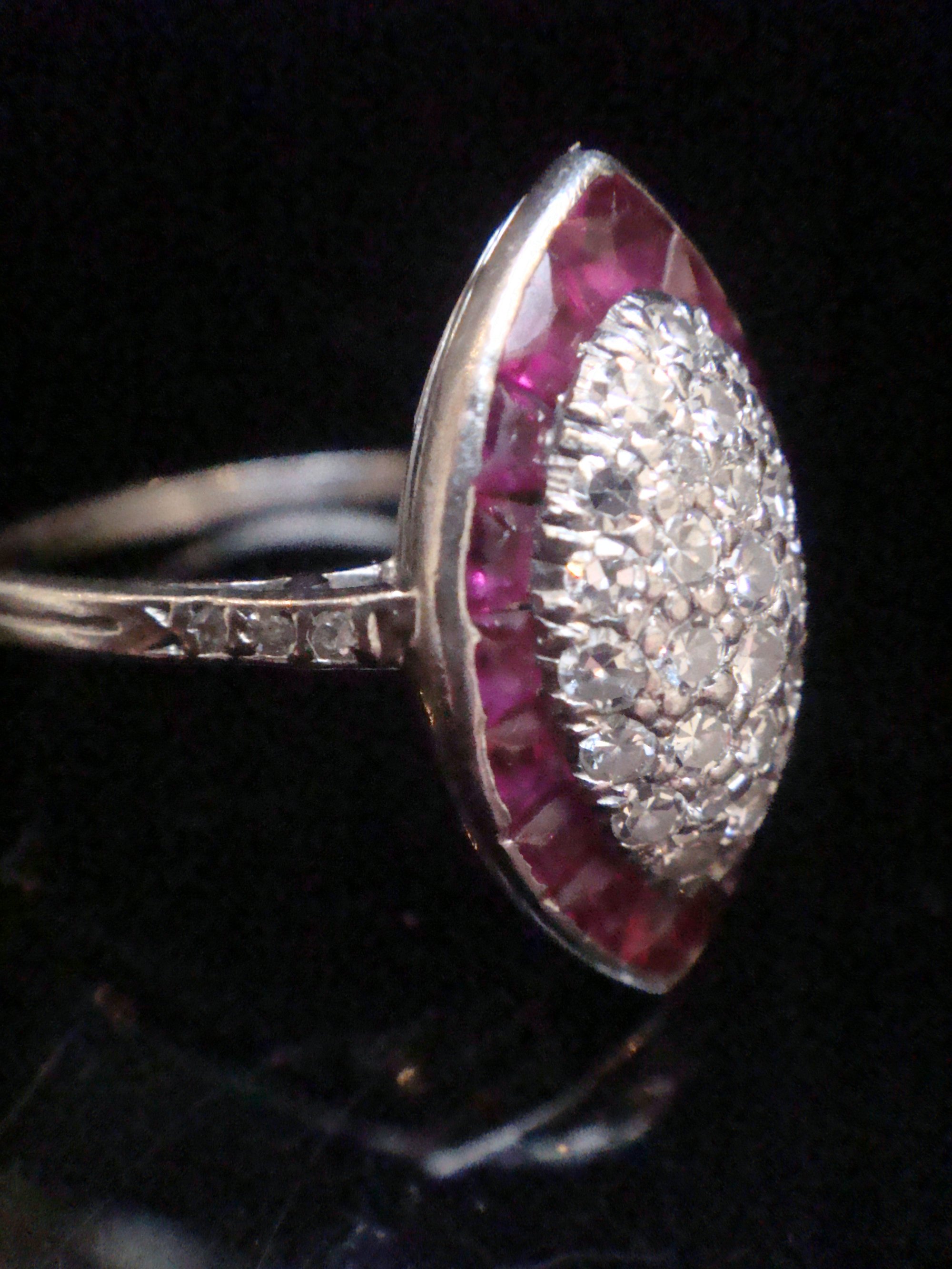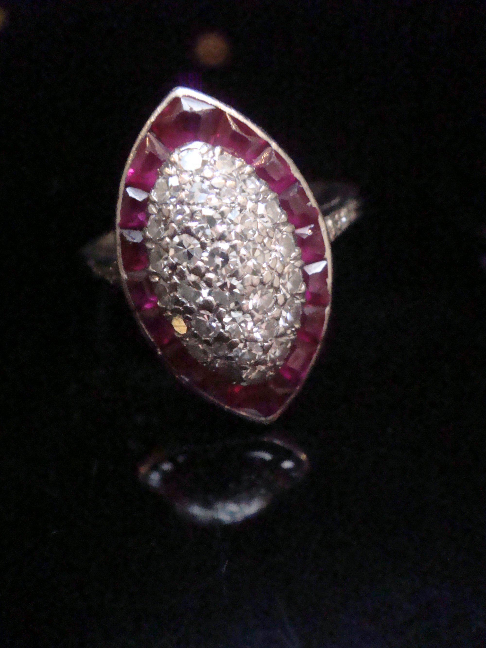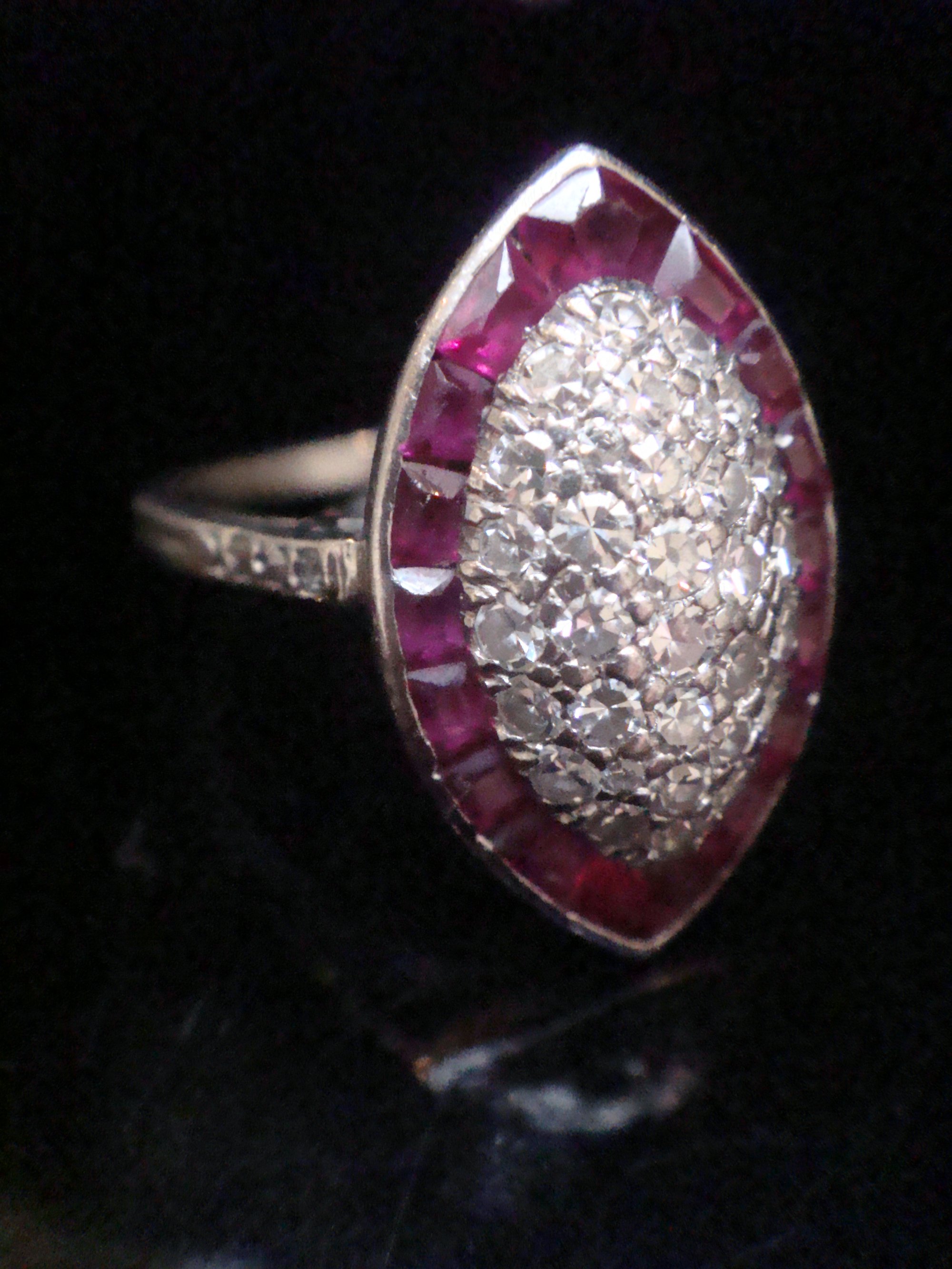 Art Deco 18ct natural ruby and diamond marquis cluster ring