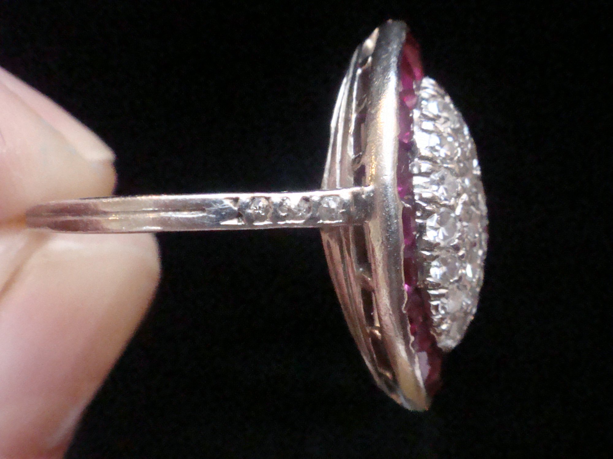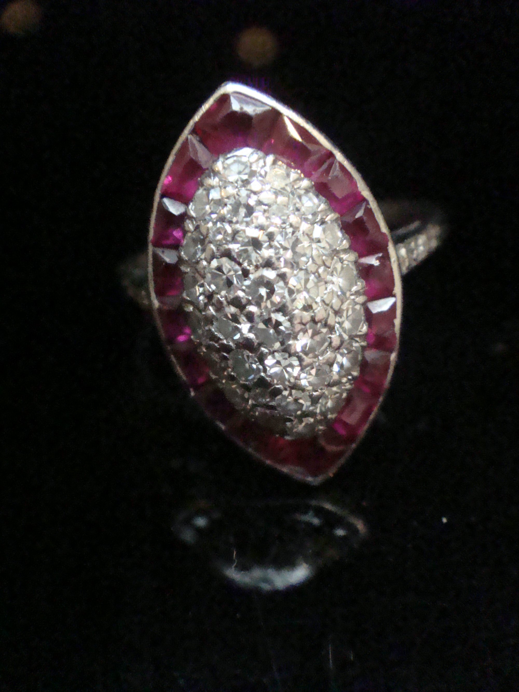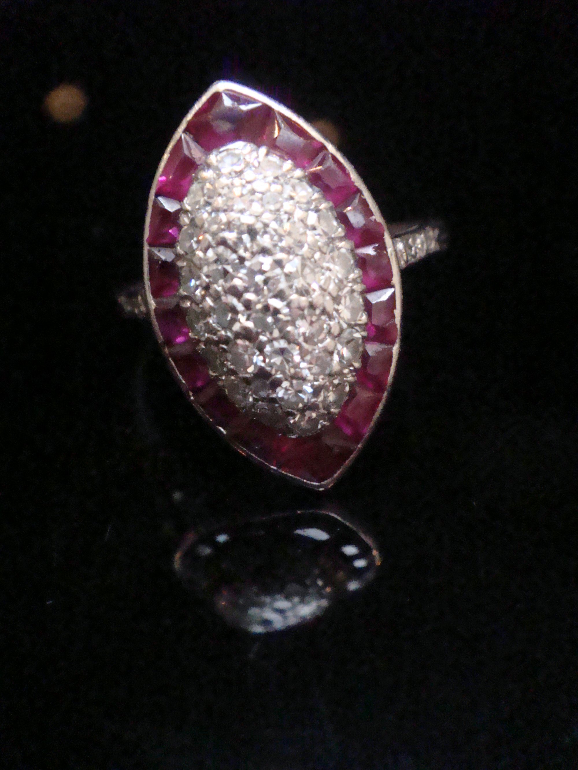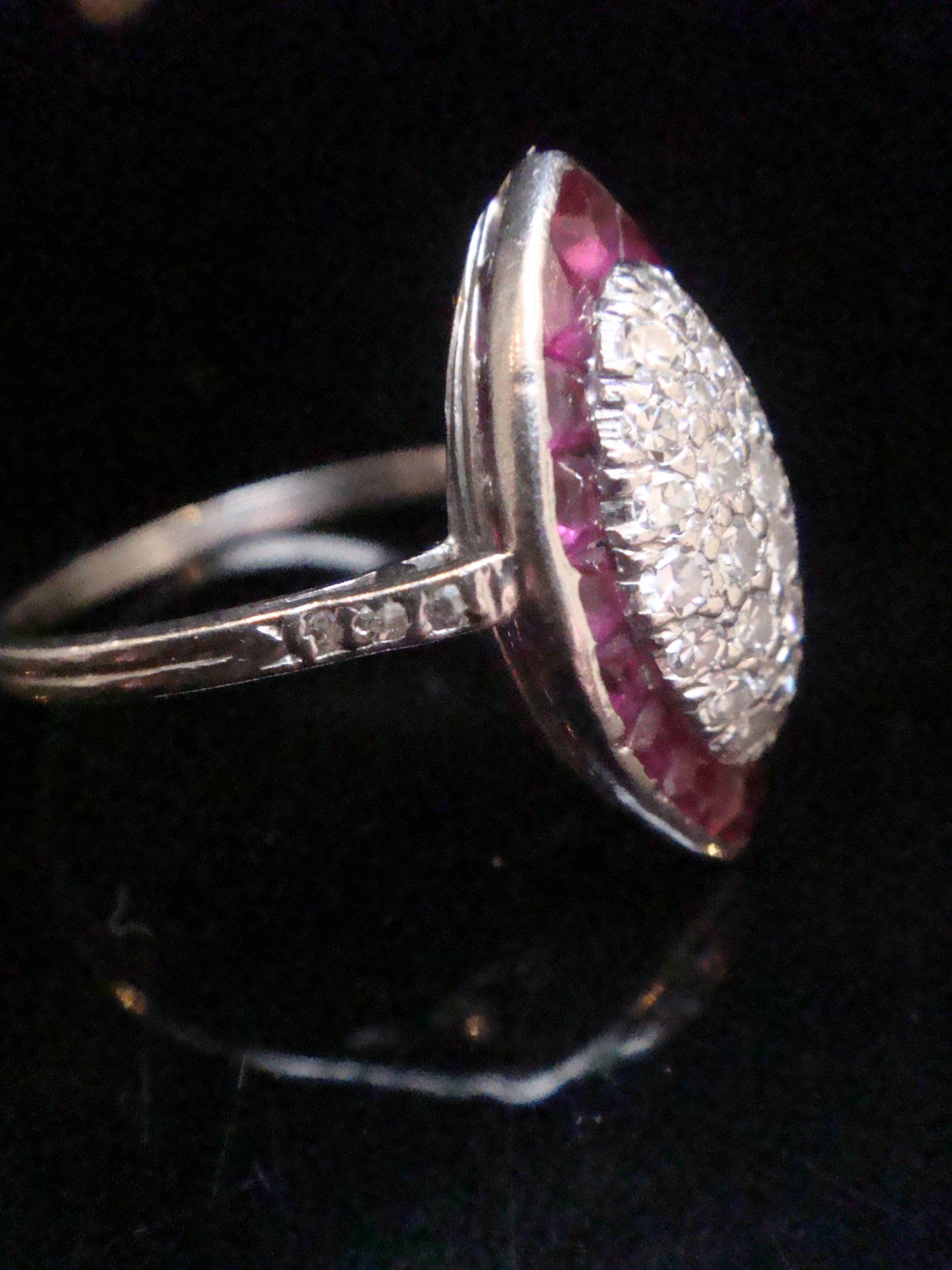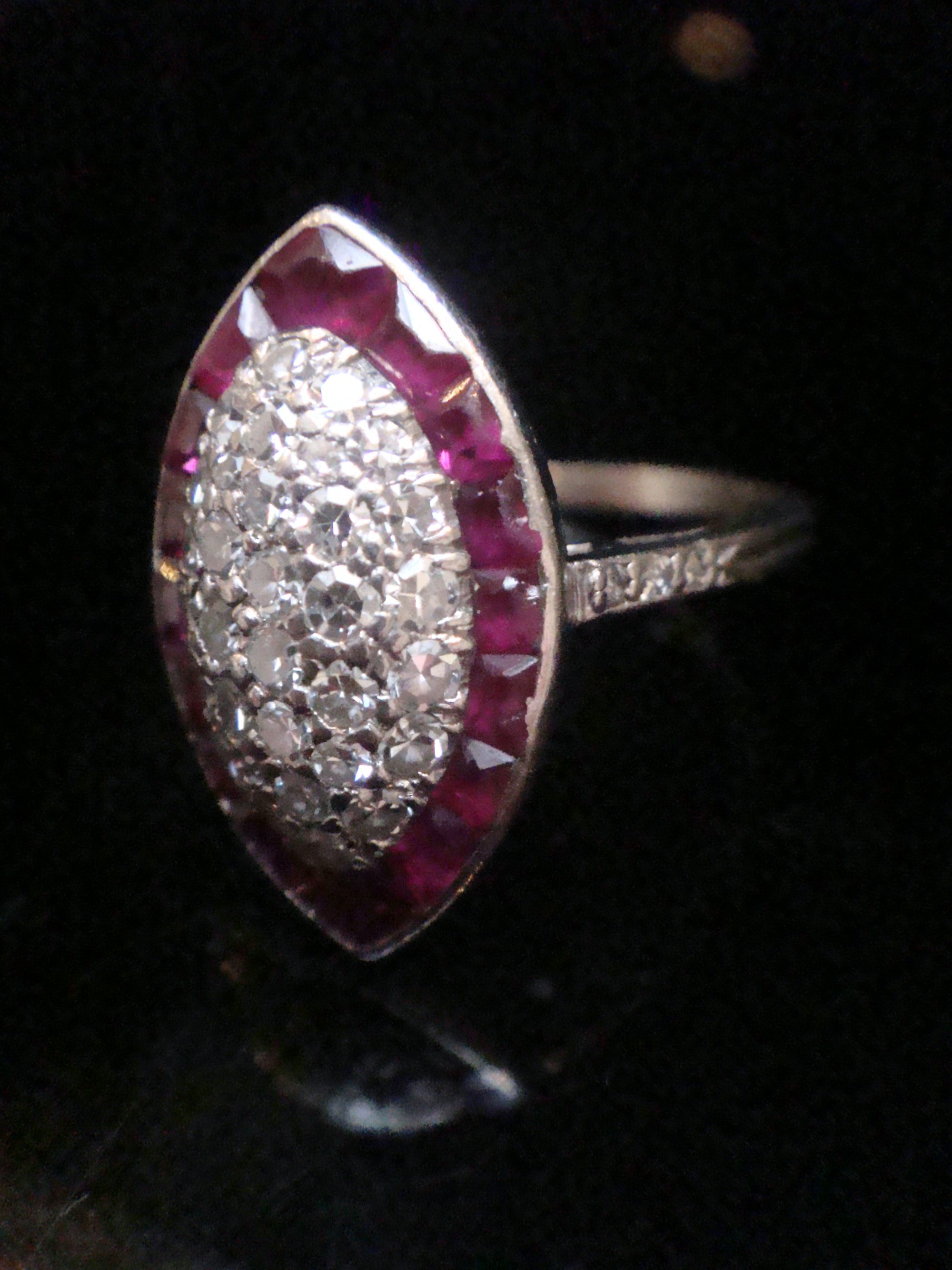 Art Deco 18ct natural ruby and diamond marquis cluster ring