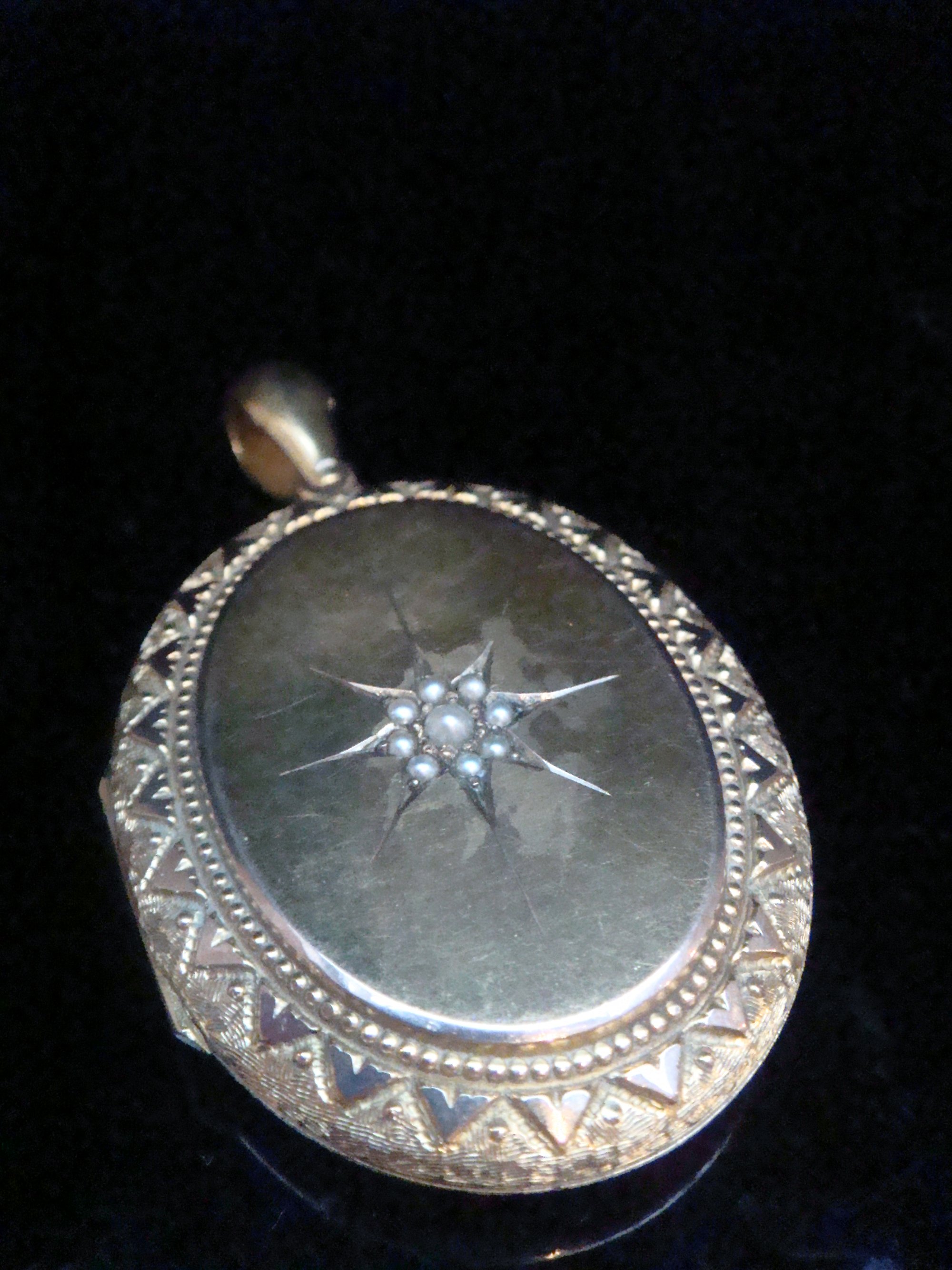 A stunning Antique Edwardian / Victorian 15ct yellow gold locket featuring a pearl star on one side and an engraving the other