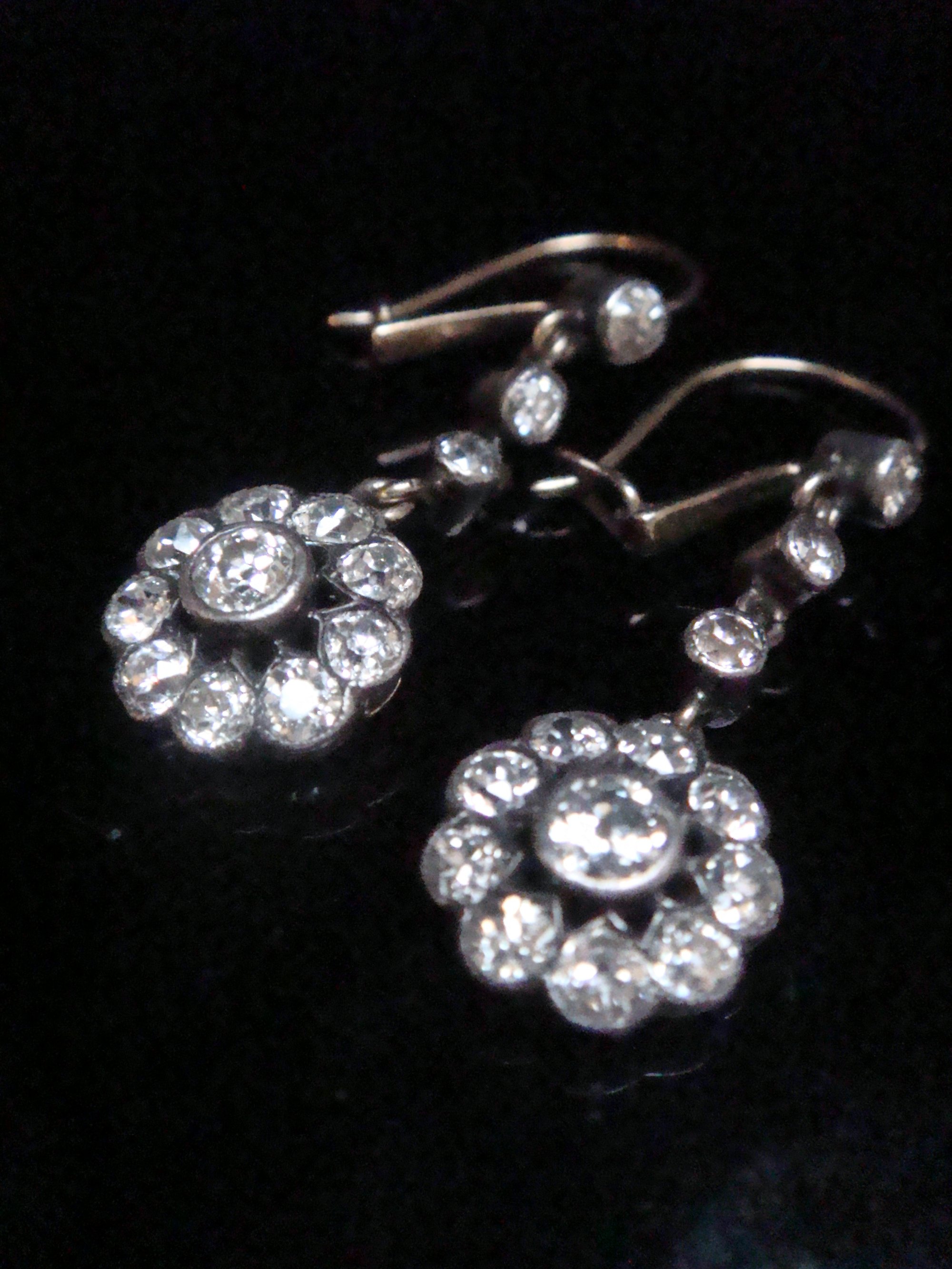 A stunning pair of diamond drop earrings set in 18ct yellow gold with the diamond being set in likely silver . Just sublime. These are beautiful original old cut diamonds Edwardian earrings, now very hard to find