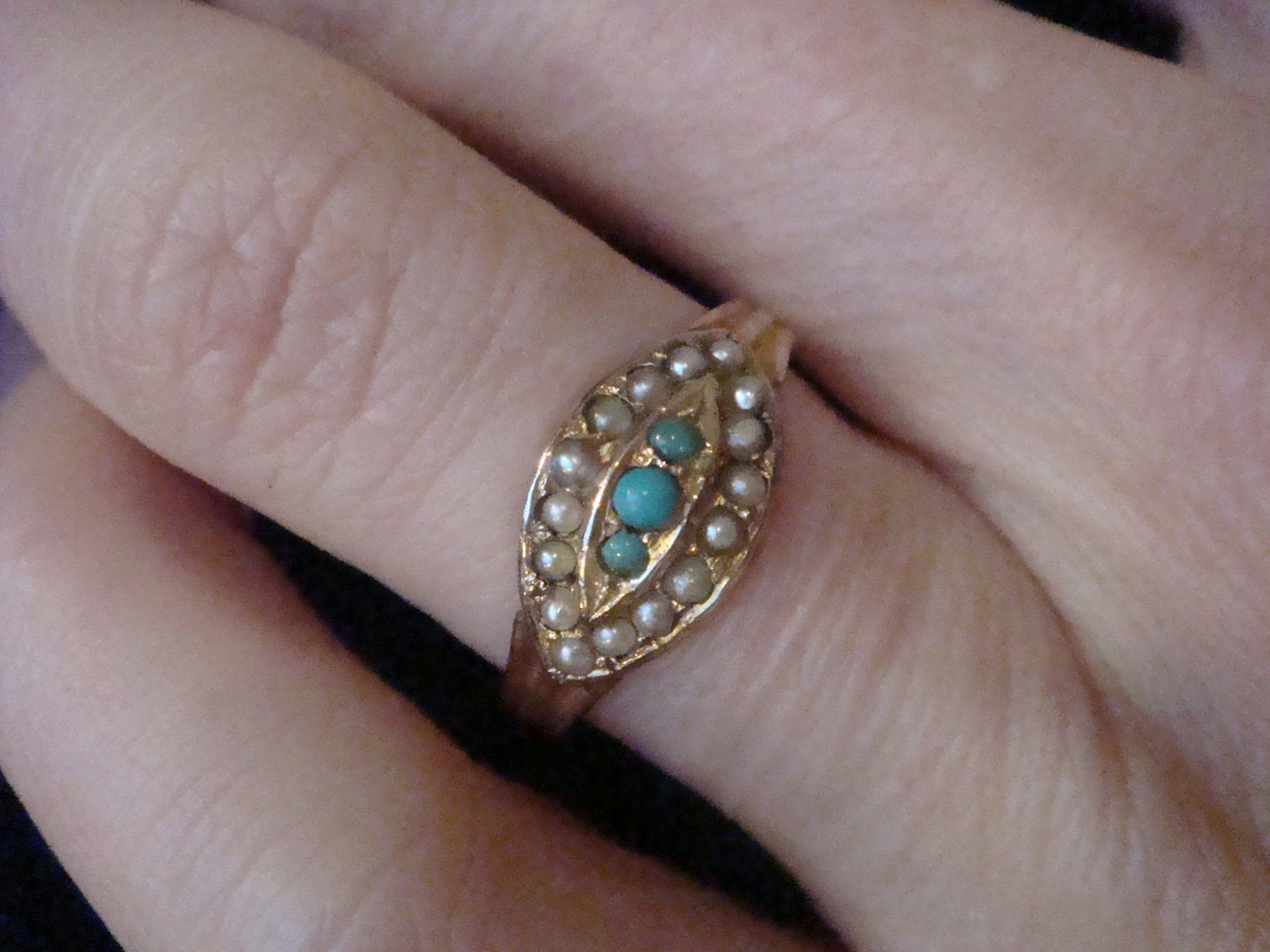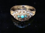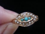 EDWARDIAN 9CT TURQUOISE AND PEARL EVIL EYE RING 1.5G