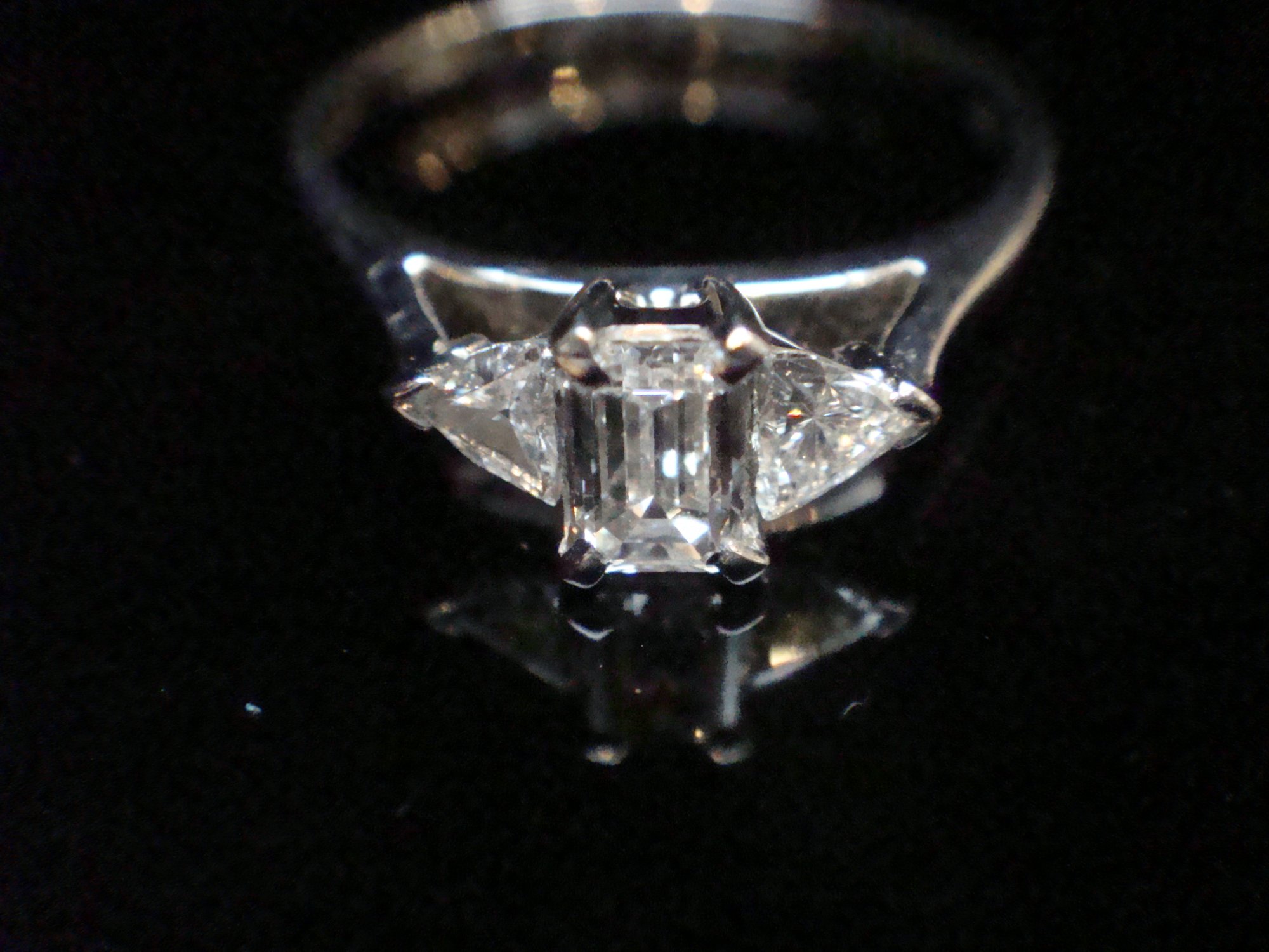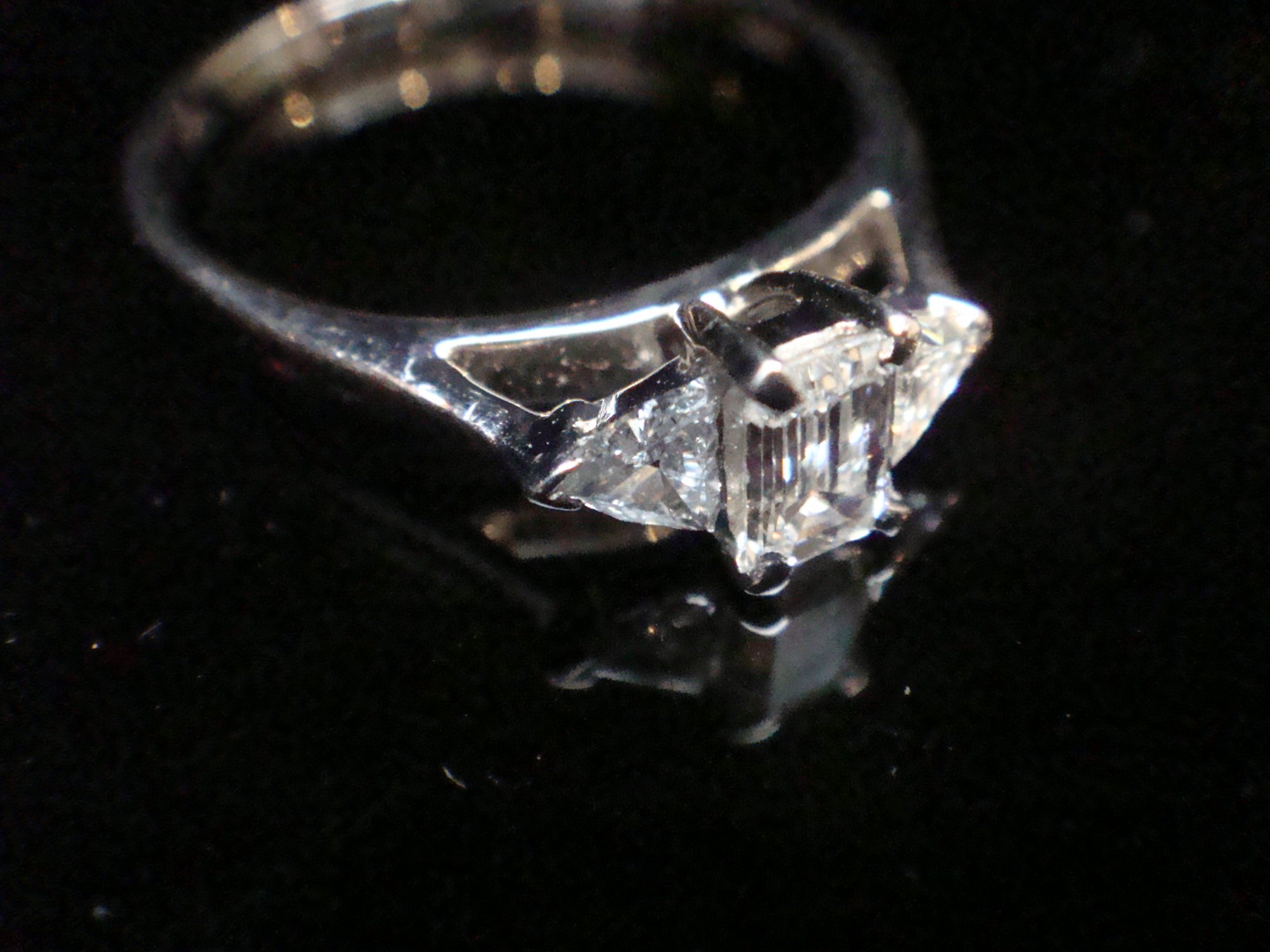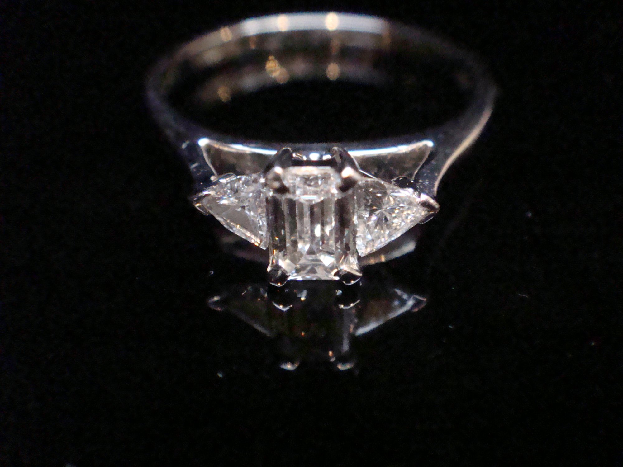 A lovely platinum diamond ring set with an emerald cut diamond between two trillion cut diamonds- these are very expensive cuts of diamond