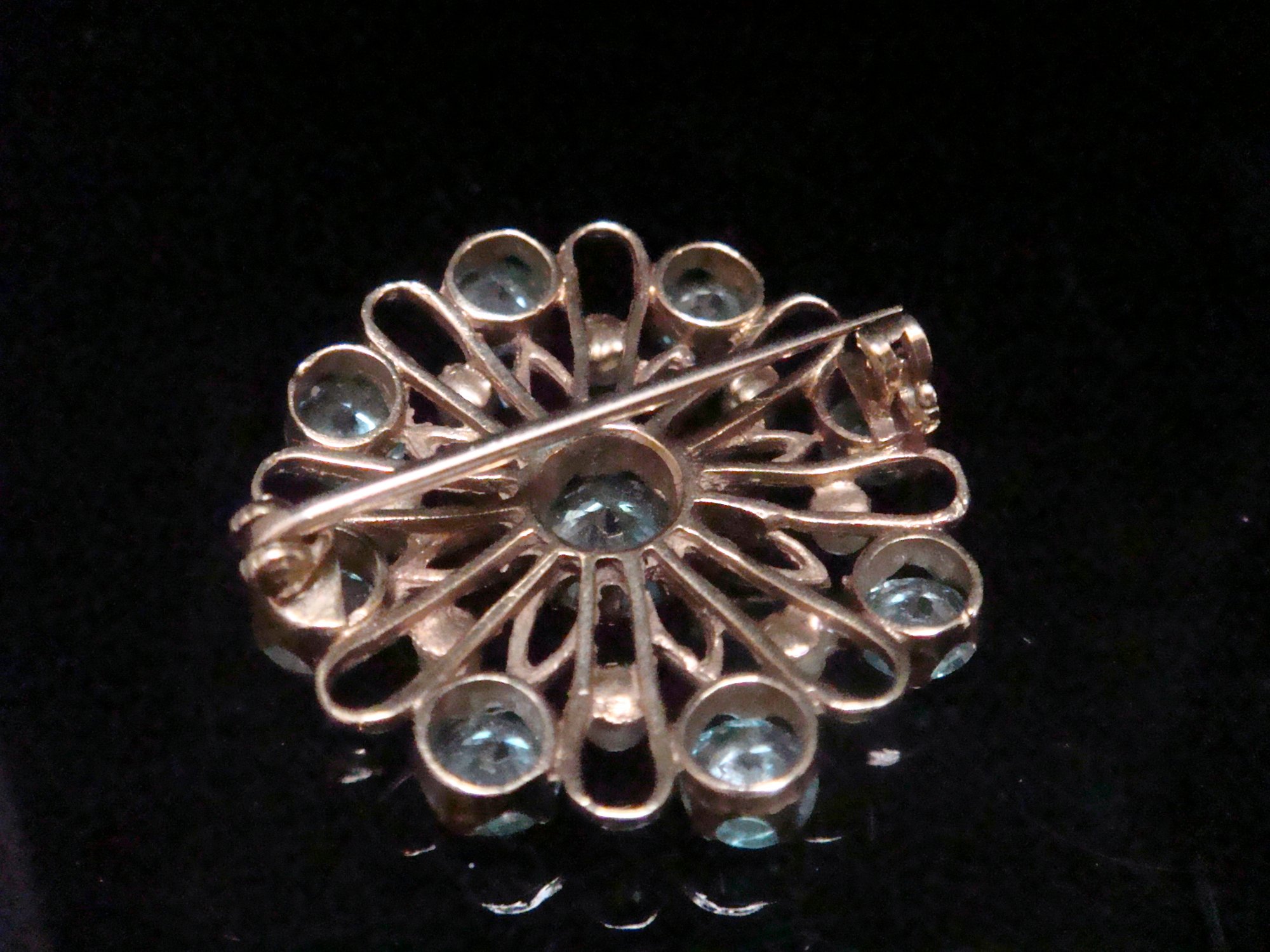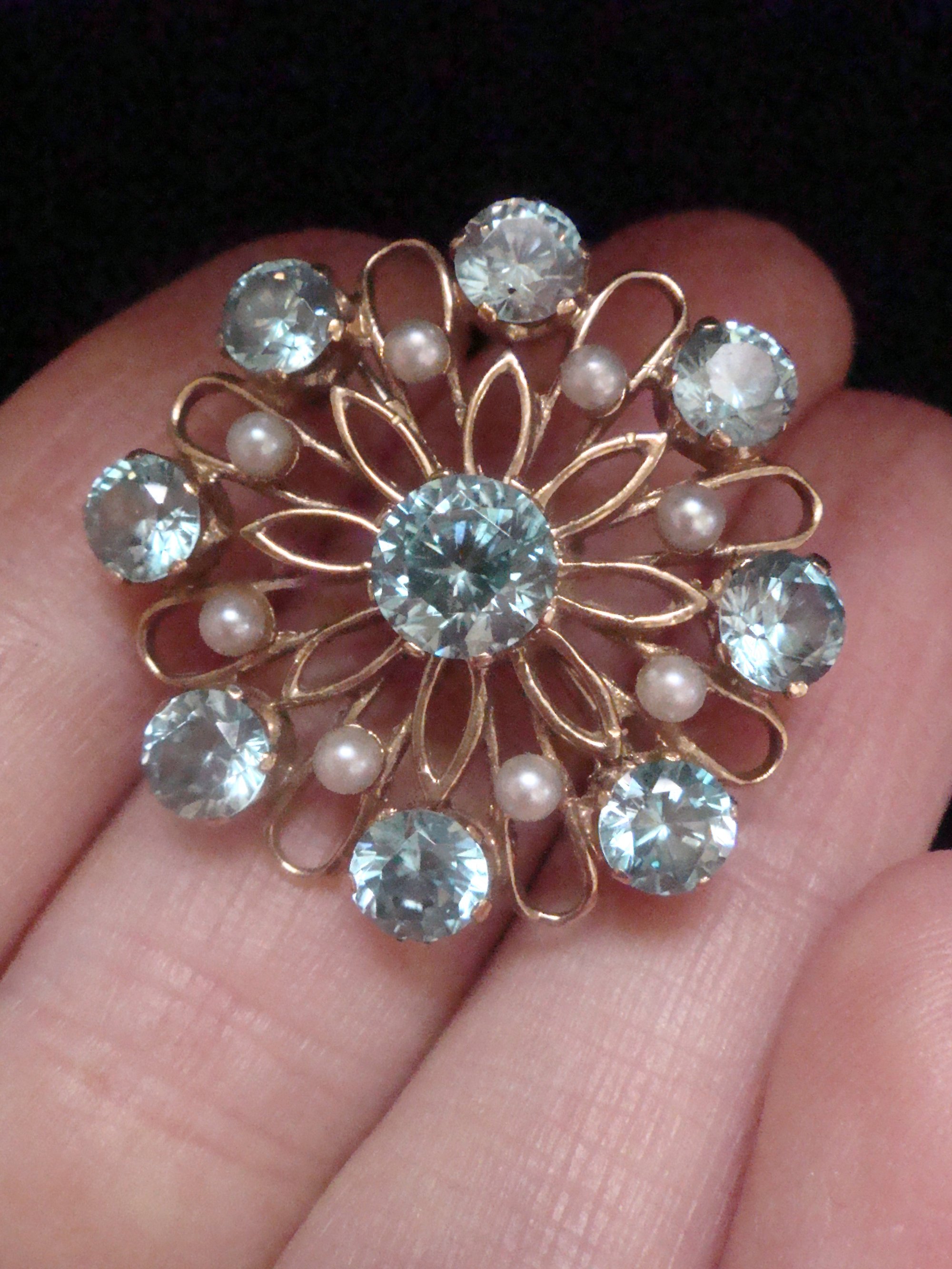 RETRO VINTAGE 9CT NATURAL BLUE ZIRCON AND CULTURED PEARL BROOCH